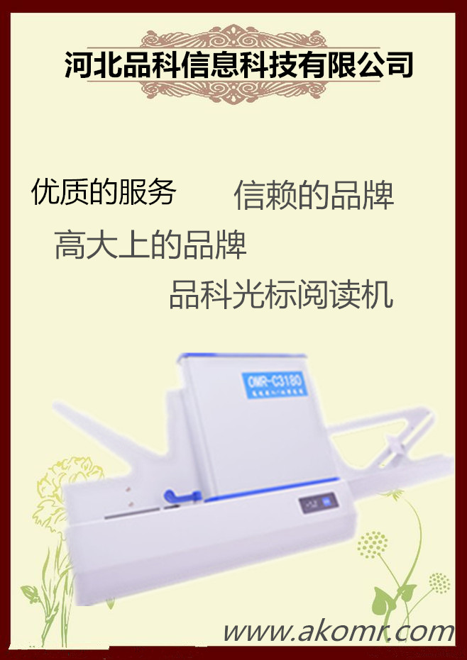 河北品科信息科技有限公司,是集生產、研發和銷售為一體的高科技企業,目前主要從事光標閱讀機(簡稱OMR:Optical Mark Reader)、網上閱卷及其相關產品(機讀卡、軟件)的開發生產和銷售。 公司自成立以來,依托雄厚的技術實力和研發背景,一直致力于自有知識產權軟硬件的產品的研制和開發,在數據處理產品領域(OMR)推出了一系列具有國內外水平的產品,已擁有三個系列的光標閱機產品,為廣大用戶提供而完善的解決方案,可靠而安全的系統集成,而周到的技術服務,應用范圍覆蓋了教育、郵電、通訊、金融、證券、稅務、統計等諸多領域,產品遠銷海內外多個和地區。