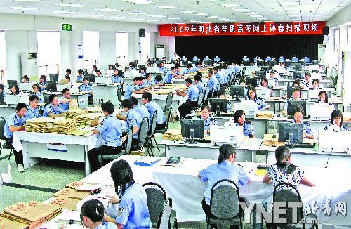 經過武警和當地考試機構的嚴格檢查,記者首入設置在河北省考試院的答題卡掃描現場。寬敞明亮的大廳內,100多名河北某司法院校的學生經過培訓,正在按流水線操作、軍事化管理的方式,在26臺高速掃描儀上分科目進行高考答題卡的掃描。