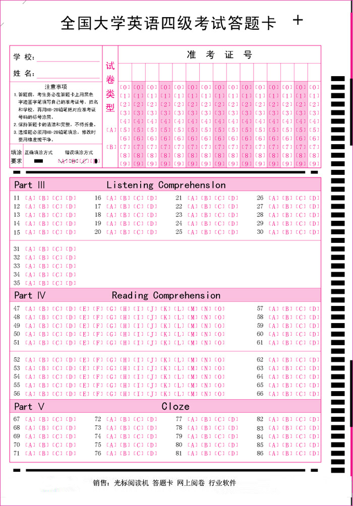 我們的答題卡采用75克到130克木漿紙,紙張纖維長(zhǎng)、薄厚均勻、挺括程度好、施膠度較高、光滑度好、漲縮均勻且漲縮較小,防潮、抗皺、錯(cuò)誤填涂易擦除。