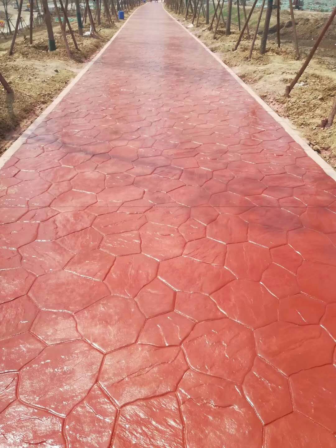 4.彩色脫模粉處理:施工的表面均勻拋撒彩色脫模粉,將整個(gè)表面覆蓋,同時(shí)在模具的表面也撒上一些脫模粉;